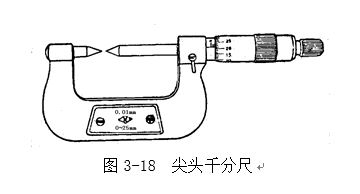 尖頭千分尺如圖3-18所示,主要用來測量零件的厚度、長度、直徑及小溝槽。如鉆頭和偶數(shù)槽絲錐的溝槽直徑等。