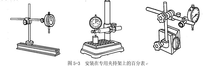 2  使用百分表或千分表時,必須把它固定在可靠的夾持架上(如固定在萬能表架或磁性表座上,圖5-3所示),夾持架要安放平穩(wěn),免使測量結(jié)果不準(zhǔn)確或摔壞百分表。