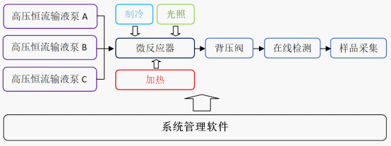 如圖所示,物料通過(guò)高壓輸液泵輸送到微反應(yīng)器中,在高壓密閉的微通道管路中,通過(guò)溫度控制,,使合成反應(yīng)能夠快速完成并極大提高收率,背壓閥能夠人為控制反應(yīng)器內(nèi)壓力,物料在出口處通過(guò)在線檢測(cè)器檢測(cè)合成結(jié)果,經(jīng)過(guò)檢測(cè)后的產(chǎn)品可通過(guò)樣品采集器按預(yù)設(shè)的收集條件收集到不同的容器中。整個(gè)反應(yīng)系統(tǒng)可通過(guò)管理軟件實(shí)現(xiàn)自動(dòng)控制,具有方法建立、模塊搭建、模塊參數(shù)設(shè)置,全反應(yīng)過(guò)程參數(shù)實(shí)時(shí)監(jiān)控,數(shù)據(jù)追溯,用戶(hù)管理及智能專(zhuān)家數(shù)據(jù)庫(kù)等功能,專(zhuān)用管理軟件可將整個(gè)反應(yīng)體系效率發(fā)揮到極致。