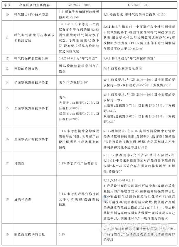 新標(biāo)準(zhǔn)在顆粒物過濾效率檢測方法(檢測設(shè)備分辨率、顆粒物粒徑的換算方法、KP過濾元件過濾效率加載測試終點判斷方法)、泄露性的檢測方法、呼吸阻力的檢測方法、呼吸阻力的技術(shù)要求、呼氣閥氣密性的技術(shù)要求和檢測方法、呼氣閥保護(hù)裝置的名稱、死腔的檢測方法、半面罩視野的技術(shù)要求、全面罩視野的技術(shù)要求、全面罩鏡片的技術(shù)要求、可燃性、清洗和消毒、制造商應(yīng)提供的信息、使用性能、頭帶測試方法等方面的要求都進(jìn)一步細(xì)化。