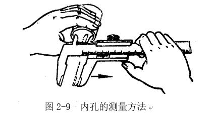 4 當(dāng)測量零件的內(nèi)尺寸時:圖2-9所示。要使量爪分開的距離小于所測內(nèi)尺寸,進(jìn)入零件內(nèi)孔后,再慢慢張開并輕輕接觸零件內(nèi)表面,用固定螺釘固定尺框后,輕輕取出卡尺來讀數(shù)。取出量爪時,用力要均勻,并使卡尺沿著孔的中心線方向滑出,不可歪斜,免使量爪扭傷;變形和受到不必要的磨損,同時會使尺框走動,影響測量精度。